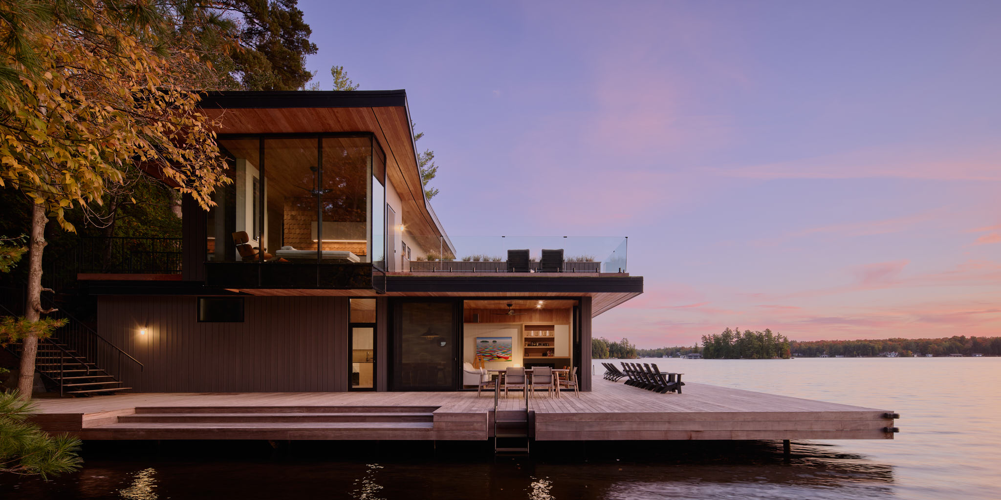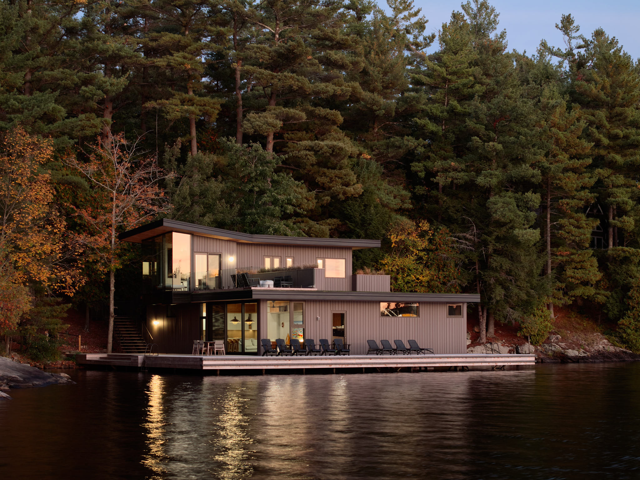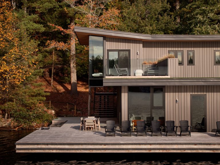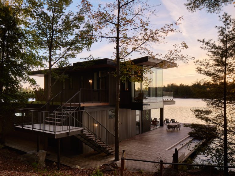 Materiality is durable, elected to weather gracefully in the lakeside environment. Warm wood soffits and interiors contrast with darker exterior cladding, grounding the building within the landscape and echoing the tones of the surrounding Canadian shield.