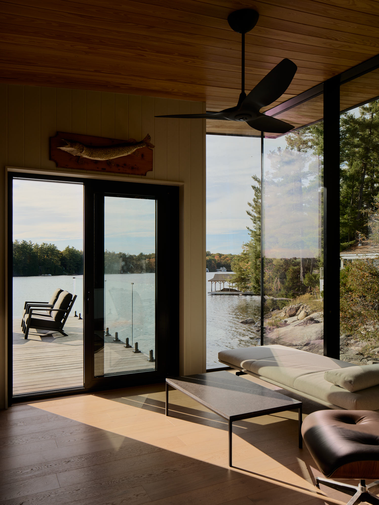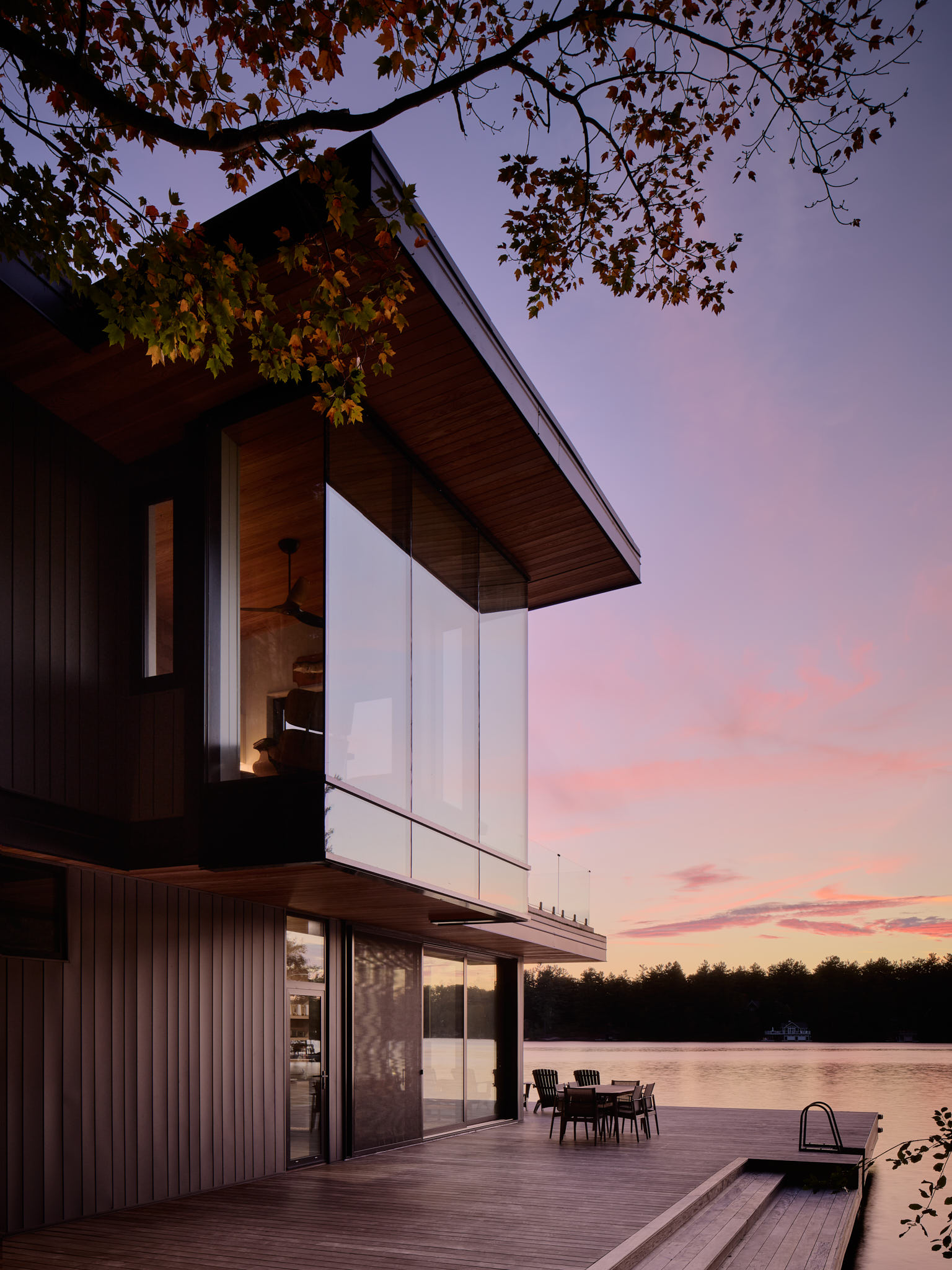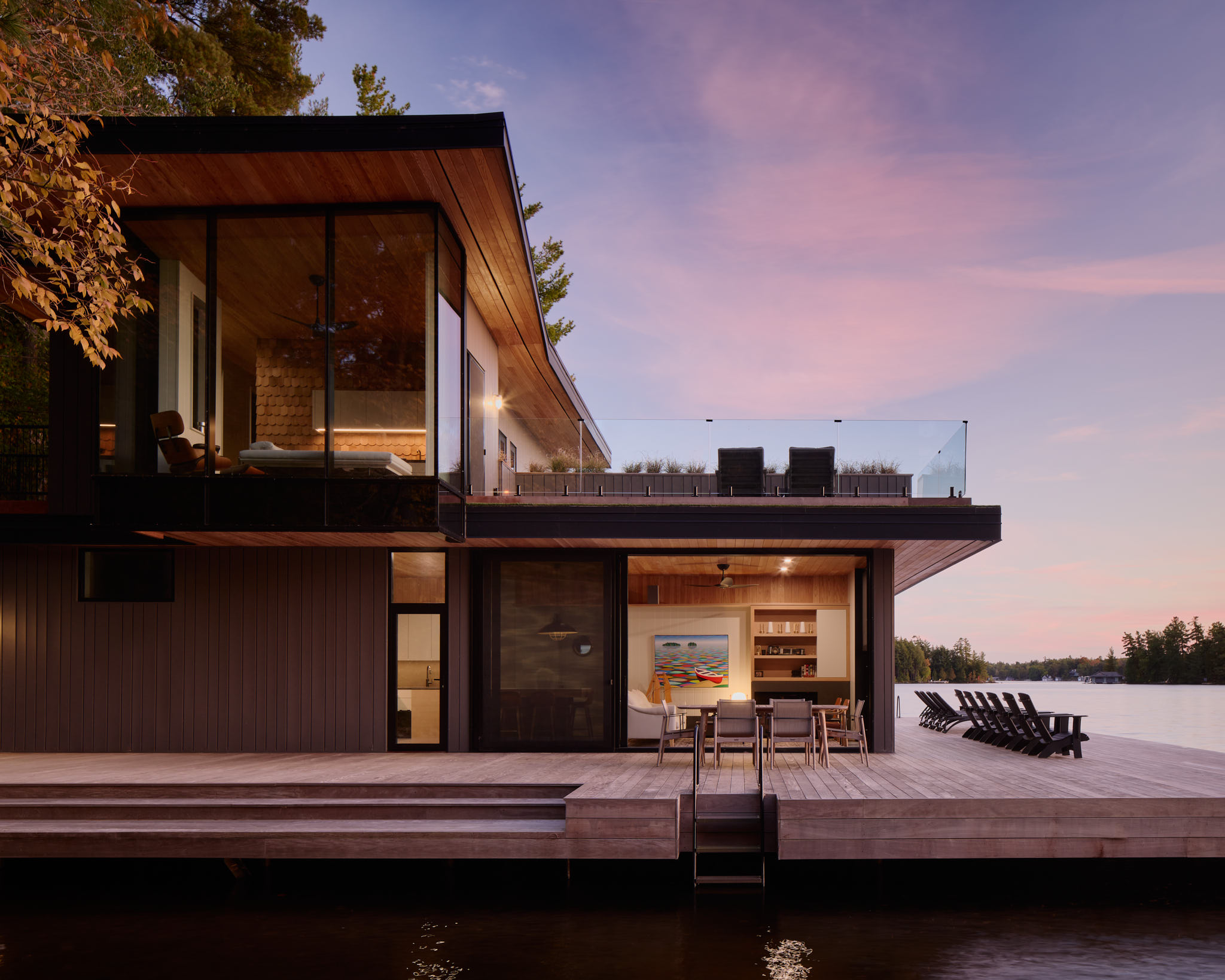 Materiality is durable, elected to weather gracefully in the lakeside environment. Warm wood soffits and interiors contrast with darker exterior cladding, grounding the building within the landscape and echoing the tones of the surrounding Canadian shield.