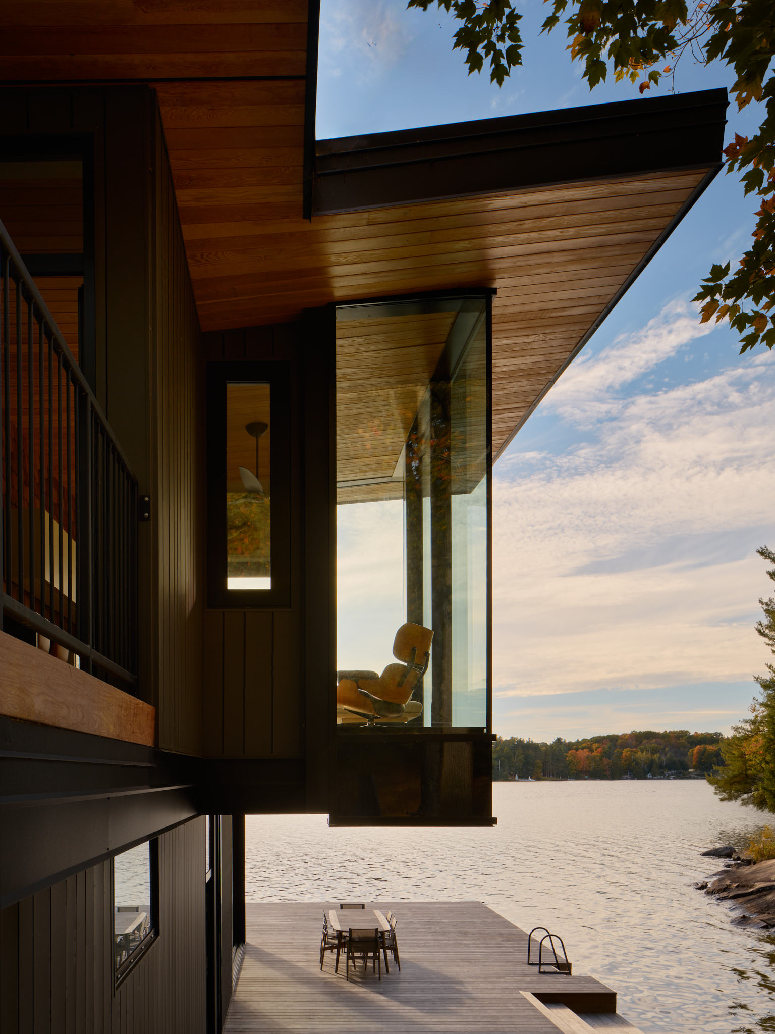 The building is composed of stacked volumes, minimizing the visual impact from the lake. Large expanses of glazing are used to frame lake vistas, blurring the boundary between interior and exterior, and allowing the water and surrounding forest to become an integral part of the experience. Deep overhangs provide shelter from the sun and weather.