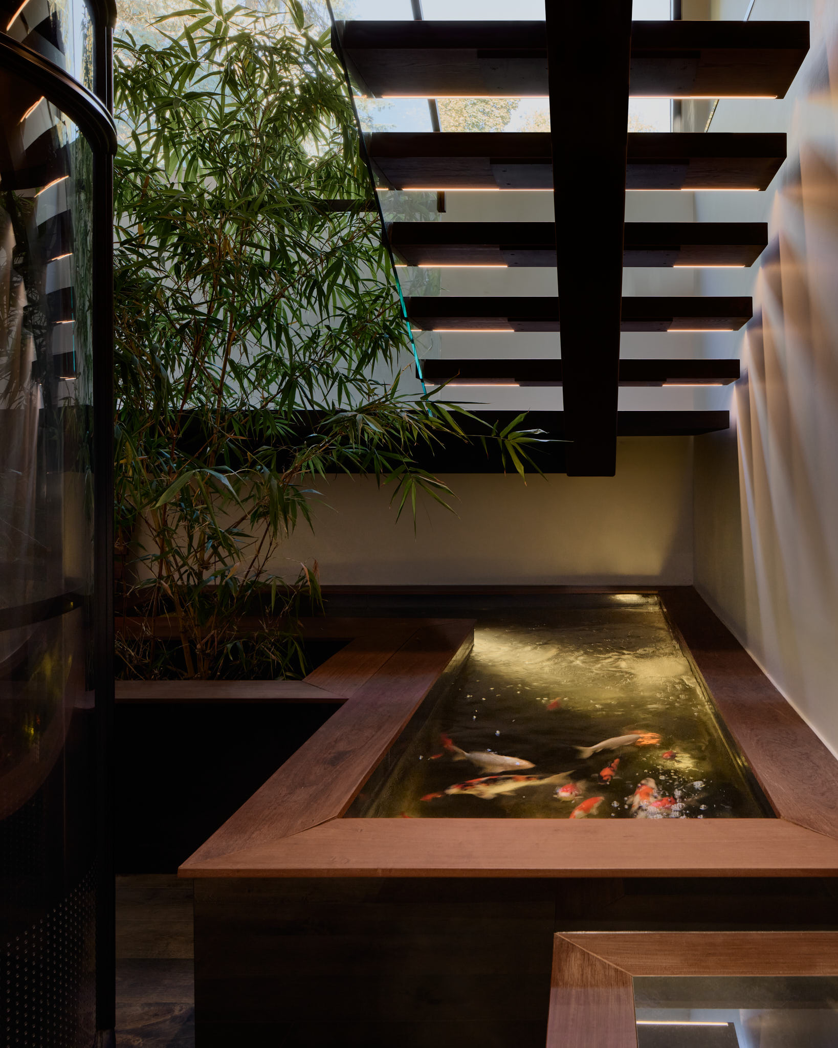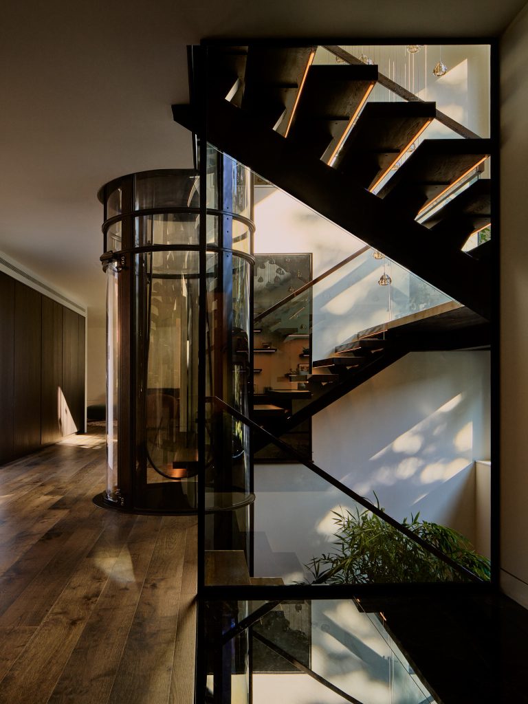 At the heart of the home is a sculptural stair, acting as both a circulation element and an organizing feature that draws daylight deep into the interior. Carefully positioned glazing creates shifting light patterns throughout the day, animating the interior spaces and reinforcing the sense of vertical connection between levels.