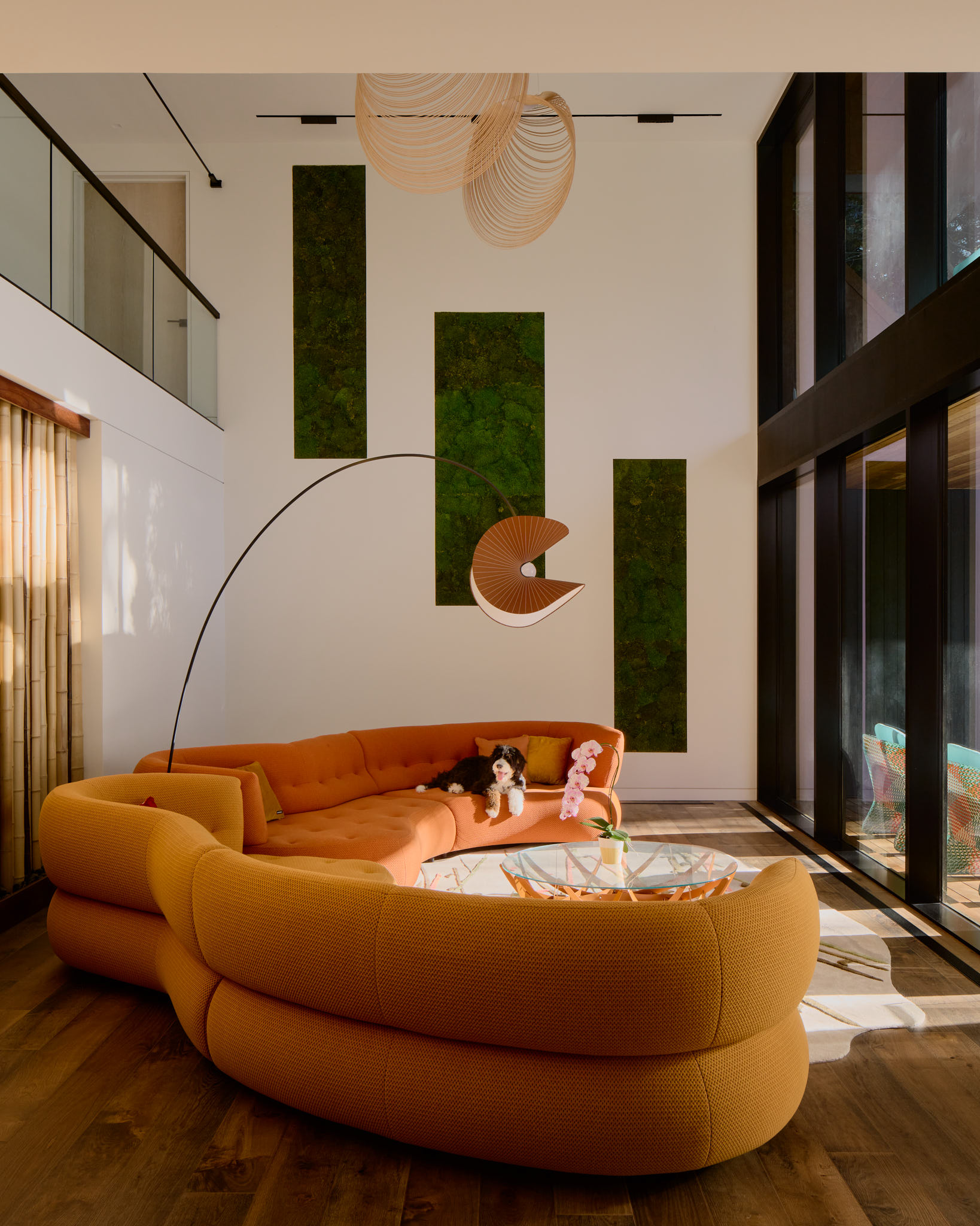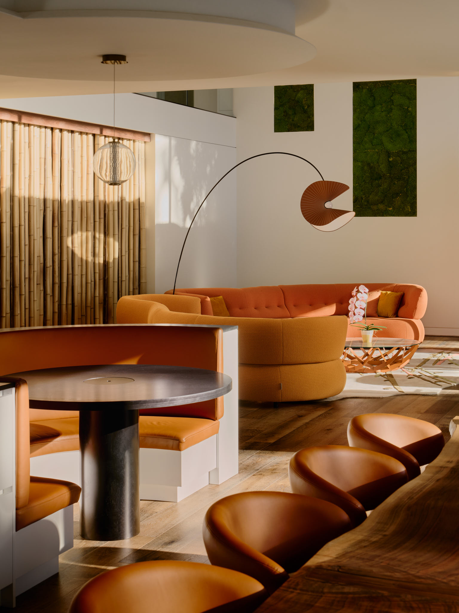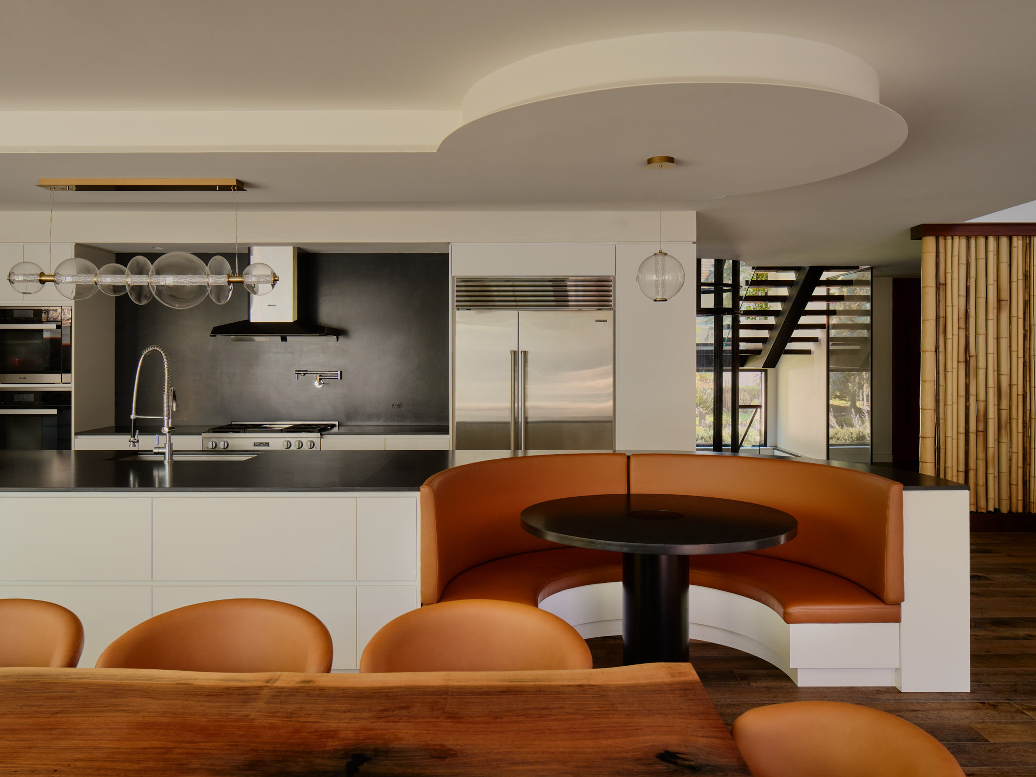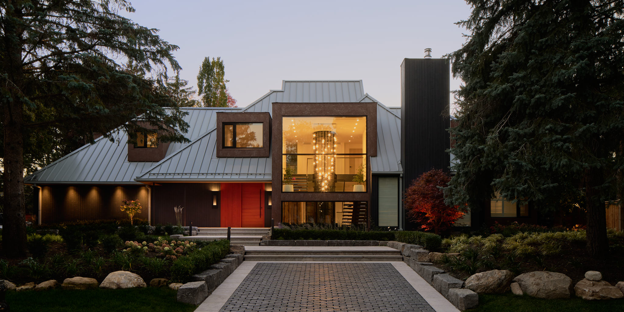 Material selections emphasize warmth and contrast. Rich wood, refined stone and dark detailing create the homes moderen lines, which are tempered by the organic, natural elements. Interior spaces flow seamlessly from one to the next, with moments of compression and release that create a dynamic yet comfortable living environment.
